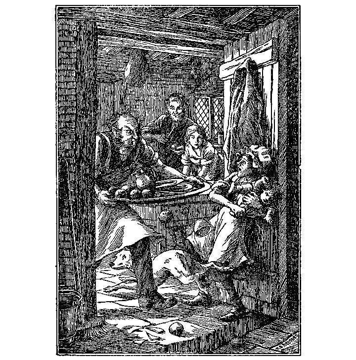 Thus the night passed. The moon went down; the stars grew pale; the cold day broke; the sun rose. The Carrier still sat, musing, in the chimney-corner. He had sat there, with his head upon his hands, all night. All night the faithful Cricket had been Chirp, Chirp, Chirping on the Hearth. All night he had listened to its voice. All night the Household Fairies had been busy with him. All night she had been amiable and blameless in the glass, except when that one shadow fell upon it.