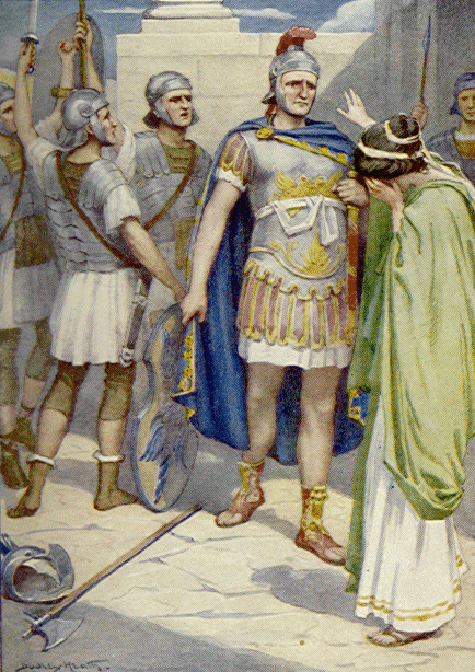 When she saw Horatius, wearing on his shoulders the cloak of her betrothed, which she herself had embroidered, she broke into bitter sobs and began to curse him for his cruel deed.