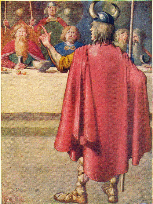 Among these wise men was an old peasant named Egil Ulserk. In the days of Harald Fairhair, Egil had been a sturdy standard-bearer and a "hardy man-at-arms withal." Now, though he was old and frail, he answered the king's words thus: "I was in several battles with thy father, Harald the king, and he gave battle sometimes with many, sometimes with few people, but he always came off the victor. Never did I hear him ask counsel of his friends whether he should fly, and neither shalt thou get any such counsel from us, king. But as we know we have a brave leader, thou shalt get a trusty following from us."