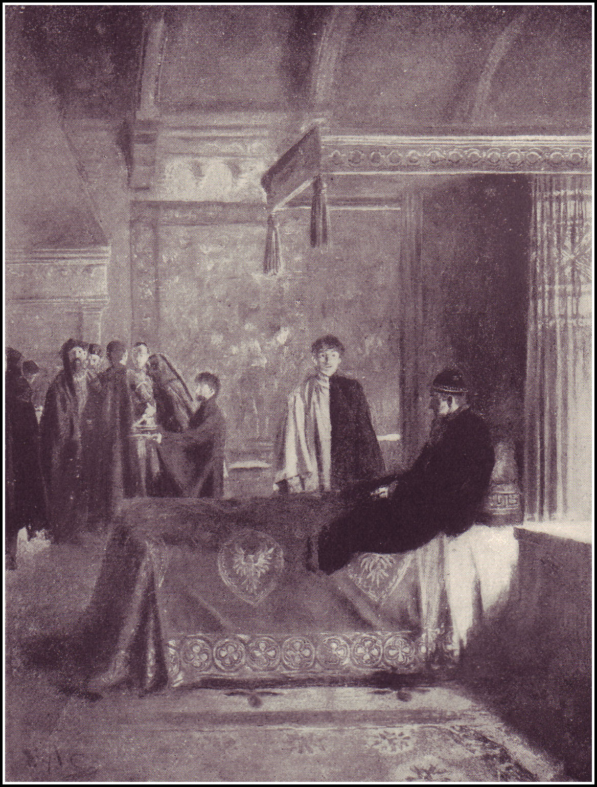 Myles needed no further bidding, but turned and left the Earl without another word. As he went out the postern-gate he looked over his shoulder, and saw the tall figure, in its long fur-trimmed gown, still standing in the middle of the path, looking after him from under the shaggy eyebrows.