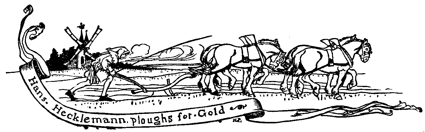 Hans Hecklemann did not tarry long in trying the new luck of his old plough, as you may easily guess. Off he went like the wind and borrowed Fritz Friedleburg's old gray horse. Then he fastened the horse to the plough and struck the first furrow. When he had come to the end of it—pop! up shot a golden noble, as though some one had spun it up from the ground with his finger and thumb. Hans picked it up, and looked at it and looked at it as though he would swallow it with his eyes. Then he seized the handle of the plough and struck another furrow—pop! up went another golden noble, and Hans gathered it as he had done the other one. So he went on all of that day, striking furrows and gathering golden nobles until all of his pockets were as full as they could hold. When it was too dark to see to plough any more he took Fritz Friedleburg's horse back home again, and then he went home himself.
