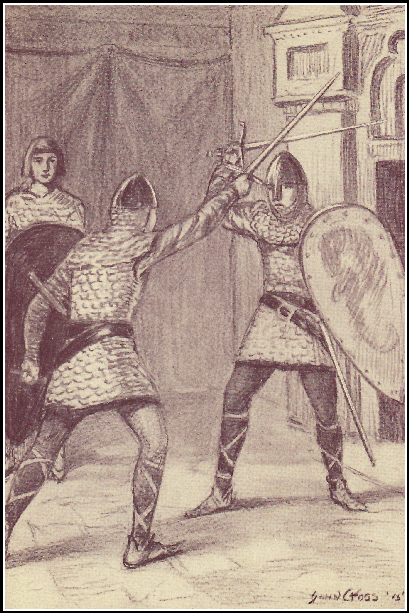 All morning a fine rain had fallen and the boys and girls of the castle had been busy indoors; the girls learning to sew and embroider, while the boys, with blunt swords, took a fencing lesson from Hugh.