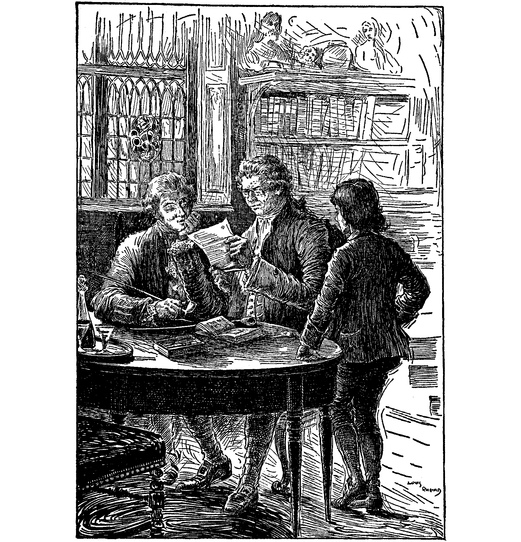 The servant led us down a matted passage, and showed us at the end into a great library, all lined with bookcases and busts upon the top of them, where the squire and Dr. Livesey sat, pipe in hand, on either side of a bright fire.