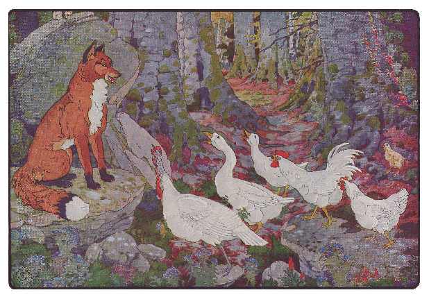 It had one little green door, and four little windows with green shutters, and in it there lived a Cock, and a Mouse, and a Little Red Hen. On another hill close by was another little house. It was very ugly. It had a door that wouldn't shut, and two broken windows, and all the paint was off its shutters. And in this house there lived a Bold Bad Fox and Four Bad Little Foxes. One morning these four bad little foxes came to the big bad Fox, and said: "Oh, Father, we're so hungry!" "We had nothing to eat yesterday," said one. "And scarcely anything the day before," said another. "And only half a chicken the day before that," said the third. "And only two little ducks the day before that," said the fourth.