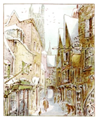 The tailor lay ill for three days and nights; and then it was Christmas Eve, and very late at night. The moon climbed up over the roofs and chimneys, and looked down over the gateway into College Court. There were no lights in the windows, nor any sound in the houses; all the city of Gloucester was fast asleep under the snow.