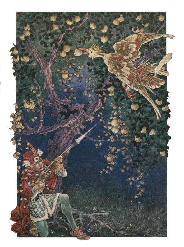 A CERTAIN king had a beautiful garden; and in the garden stood a tree which bore golden apples. These apples were always counted, and about the time when they began to grow ripe it was found that every night one of them was gone. The king became very angry at this, and ordered the gardener to keep watch all night under the tree. The gardener set his eldest son to watch; but about twelve o'clock he fell asleep, and in the morning another of the apples was missing. Then the second son was ordered to watch; and at midnight he too fell asleep, and in the morning another apple was gone. Then the third son offered to keep watch; but the gardener at first would not let him, for fear some harm should come to him: however, at last he consented, and the young man laid himself under the tree to watch. As the clock struck twelve he heard a rustling noise in the air, and a bird came flying that was of pure gold; and as it was snapping at one of the apples with its beak, the gardener's son jumped up and shot an arrow at it.