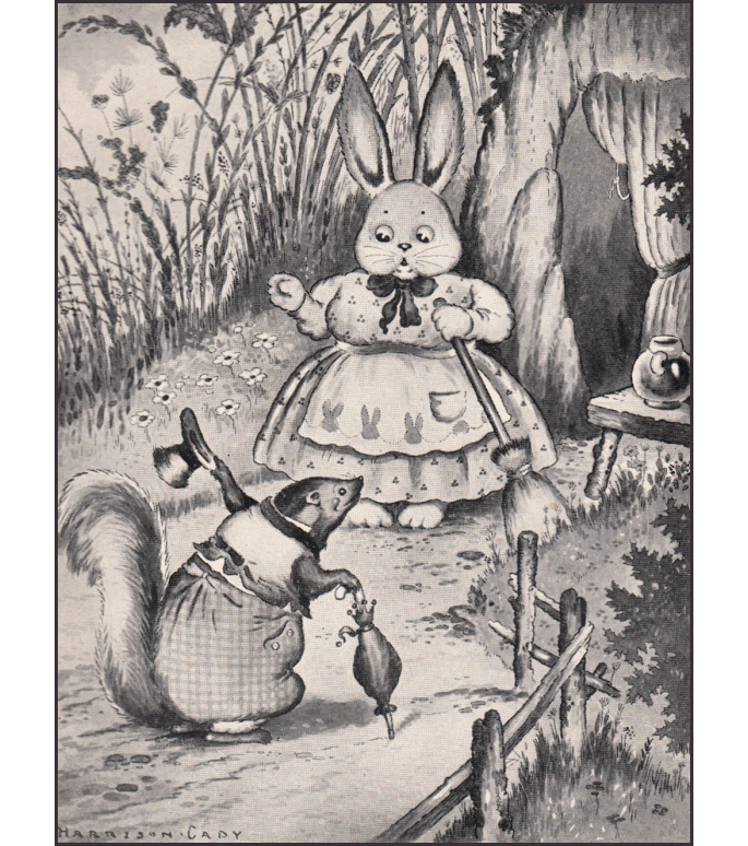 Nothing that Jimmy could say had the least effect, and so at last he agreed to take her to Peter. And so, hopping behind Jimmy Skunk, timid little Mrs. Peter Rabbit actually went into the Green Forest of which she was so much afraid, which shows how brave love can be sometimes.