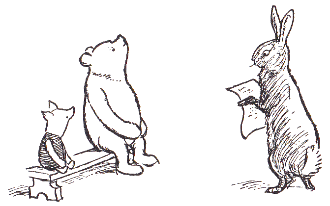 "Now listen all of you," said Rabbit when he had finished writing, and Pooh and Piglet sat listening very eagerly with their mouths open. This was what Rabbit read out: