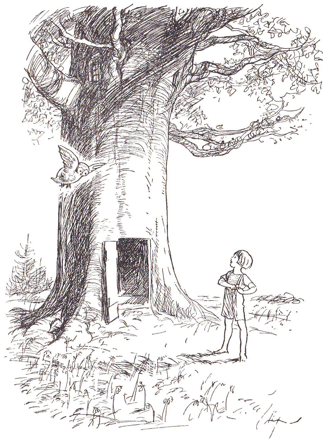 O NE day when the sun had come back over the Forest, bringing with it the scent of May, and all the streams of the Forest were tinkling happily to find themselves their own pretty shape again, and the little pools lay dreaming of the life they had seen and the big things they had done, and in the warmth and quiet of the Forest the cuckoo was trying over his voice carefully and listening to see if he liked it, and wood-pigeons were complaining gently to themselves in their lazy comfortable way that it was the other fellow's fault, but it didn't matter very much; on such a day as this Christopher Robin whistled in a special way he had, and Owl came flying out of the Hundred Acre Wood to see what was wanted.