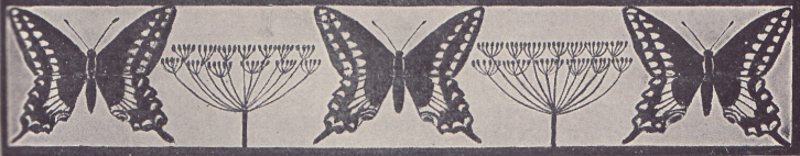 When we were children we spent hours poking these interesting creatures with straws to see them push forth their brilliant orange horns. We knew this was an act of resentment, but we did not realize that from these horns was exhaled the nauseating odor of caraway which greeted our nostrils. We incidentally discovered that they did not waste this odor upon each other, for once we saw two of the full-grown caterpillars meet on a caraway stem. Neither seemed to know that the other was there until they touched; then both drew back the head and butted each other like billy-goats, Whack! whack! Then both turned laboriously around and hurried off in a panic. The scent organs of these caterpillars are really little Y-shaped pockets in the segment back of the head, pockets full of this peculiar caterpillar perfume. Under the stimulus of attack, the pocket is turned wrong side out and pushed far out making the "horns," and at the same time throwing the strong odor upon the air. This spoils the flavor of these caterpillars as bird food, so they live on in serene peace, never hiding under the leaves but trusting, like the skunk, to a peculiar power of repelling the enemy. We must admire this caterpillar for the methodical way in which it eats the leaf: Beginning near the base, it does not burn its bridges behind it by eating through the midrib, but eats everything down to the midrib; after it arrives at the tip of the leaf it finishes midrib and all on its return journey, doing a clean job, and finishing everything as it moves along. (See Moths and Butterflies, Dickerson, p. 42.)